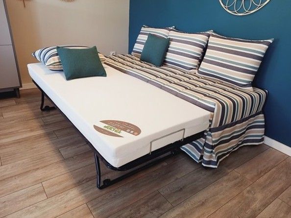 Composés de lattes de bois et d’un matelas en mousse, ils se déplient facilement.